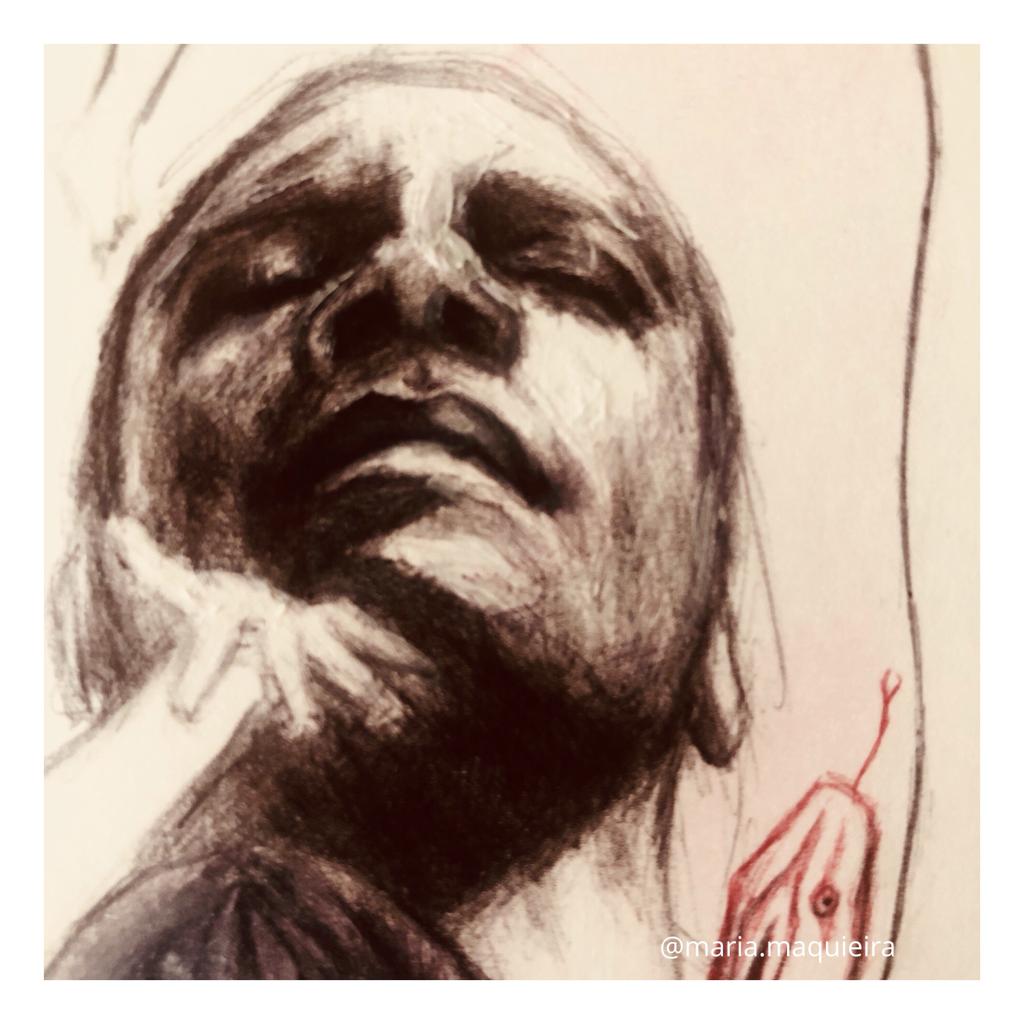 Por si esta alegría fuese poca, también puedo anunciar que el trabajo de María Maquieira está a punto de culminar. Lo que el año pasado era todavía un proyecto, hoy es prácticamente una realidad. Mi agradecimiento a María es inmenso, no sólo por poner su inagotable creatividad y talento al servicio de estos versos, transfigurándolos, sino porque me ha permitido acercarme a los detalles sensibles de su taller. Nuestra comunicación ha sido siempre muy fluida, y a pesar de la distancia existente entre Coruña y Madrid, ha sido como si pudiese verla plasmar sus ideas sobre el papel, desarrollar los bocetos y, finalmente, ver el acabado de las ilustraciones que ha elaborado para la obra. María ha creado una serie de láminas que no solo captan lo que late en los versos, sino que lo transforman y lo hacen fulgurar en un registro inesperado: allí donde la palabra se disuelve en la imagen. Una disolución que, sin embargo, amplifica su resonancia gracias a la capacidad expresiva de María. Gracias al simbolismo y la animalidad erótica y poética de su trazo.