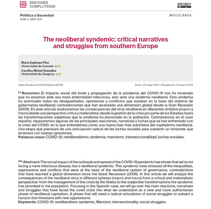Acaban de publicarnos a Carolina Meloni y a mí un artículo en la revista «Política y Sociedad» de la UCM, el cuál lleva por título «The neoliberal syndemic: critical narratives and struggles from southern Europe«. Es un texto que revisa desde un horizonte crítico el transcurso de la pandemia (2020/2021), entendiéndola como una «sindemia neoliberal». Abordamos los daños humanos y sociales que esta provocó desde una perspectiva teórica que cruza el marxismo con la interseccionalidad (clase, género y «raza»). Es un análisis del contexto español, pero con referencias a la situación europea y global. Se trata de un esbozo de análisis general -social, político, económico, subjetivo- que esperamos os resulte de interés.