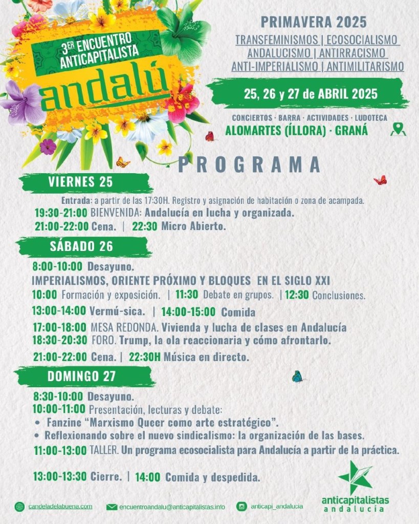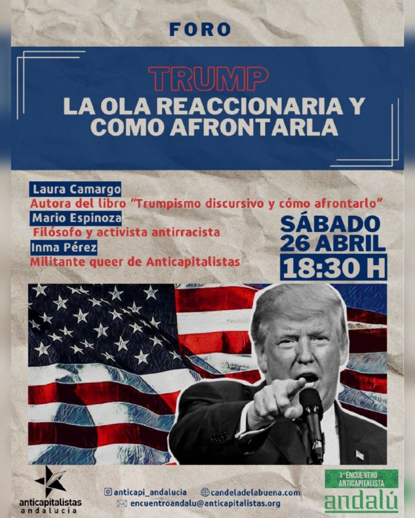 El sábado 26 de abril debatiré con Laura Camargo, autora de Trumpismo Discursivo, e Inma Pérez, militante de Anticapitalistas, en el foro Trump. La ola reaccionaria y cómo afrontarla. Este foro formará parte de las jornadas del Tercer Encuentro Anticapitalista Andalú, que tendrá lugar en Íllora (Granada). Será un placer compartir mesa con Laura e Inma para analizar la ola reaccionaria actual y desarrollar estrategias para confrontarla políticamente -algo más que necesario-. Parte de las cosas que trataré las hemos abordado en el Número 195 de la Revista Viento Sur, cuyo enfoque antirracista, feminista e interseccional ofrece pistas para combatir hoy la reacción. A continuación comparto el cartel del foro y el de las jornadas, que será de seguro muy participadas.
