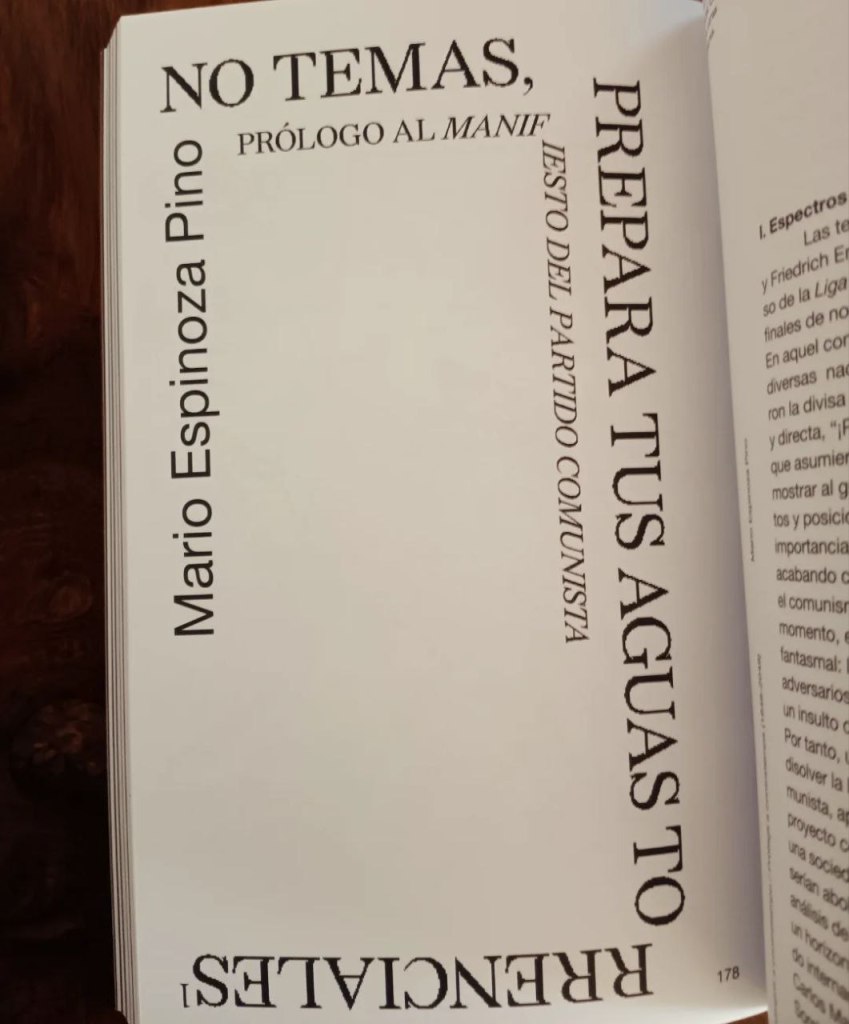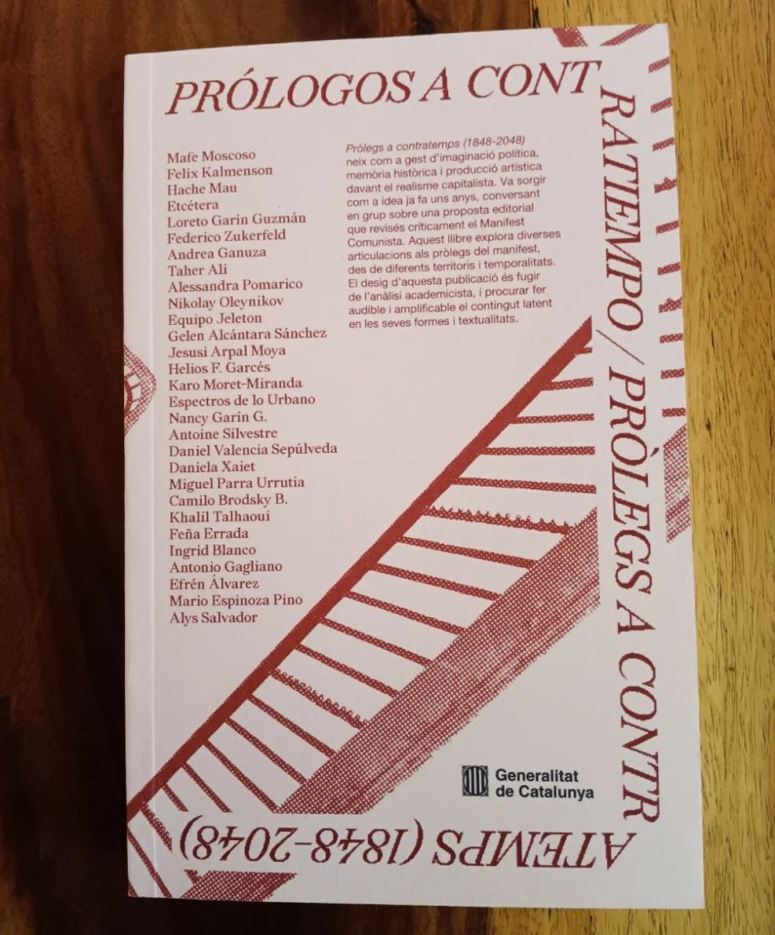 Ha sido un placer y un honor participar en este volumen de «PRÓLOGOS A CONTRATIEMPO/ PRÒLEGS A CONTRATEMPS (1848-2048)», un conjunto colectivo de prólogos al Manifiesto del Partido Comunista. Prólogos imaginarios, anti-prólogos e itinerarios políticos y poéticos inesperados a partir de este clásico de la forma-manifiesto. ¿Cómo efectuar la potencia de este manifiesto de Marx y Engels en el presente? ¿Qué imágenes, afectos, líneas de fuerza y promesas le envía a nuestro momento histórico? Gracias a Nancy Garin, Ingrid Blanco y mi querido Helios Fernández Garcés por invitarme a participar en este volumen con gente tan maravillosa y admirada. Gracias al Centre d’Arts Santa Mònica por apoyar esta iniciativa poético-política [Centre d’arts Santa Mònica].